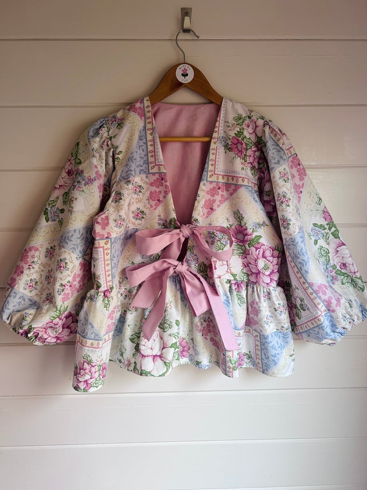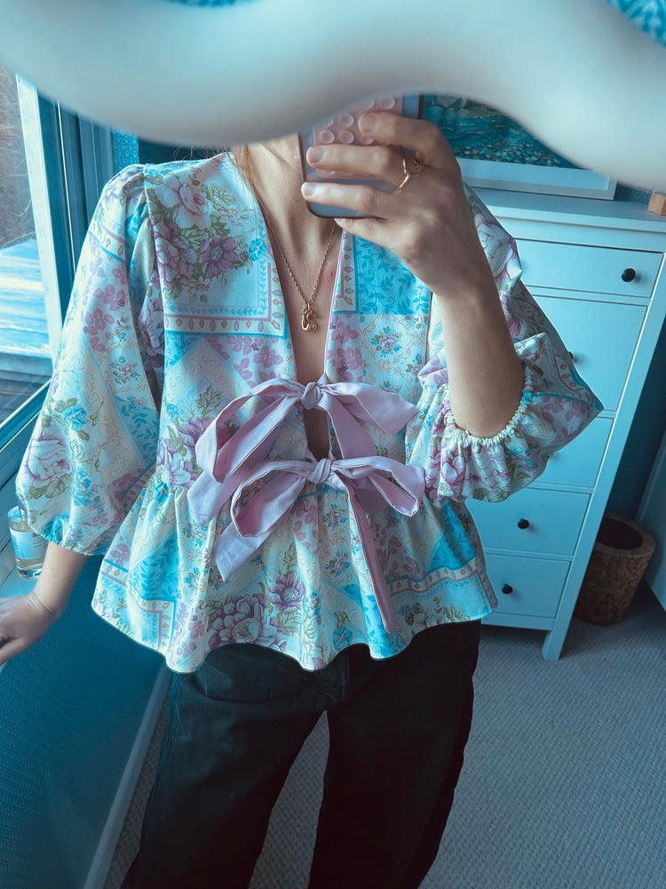 Beautiful Devizes top made from vintage fabric, finished with soft dusky pink ties and a gentle peplum hem that gives the loveliest shape.
