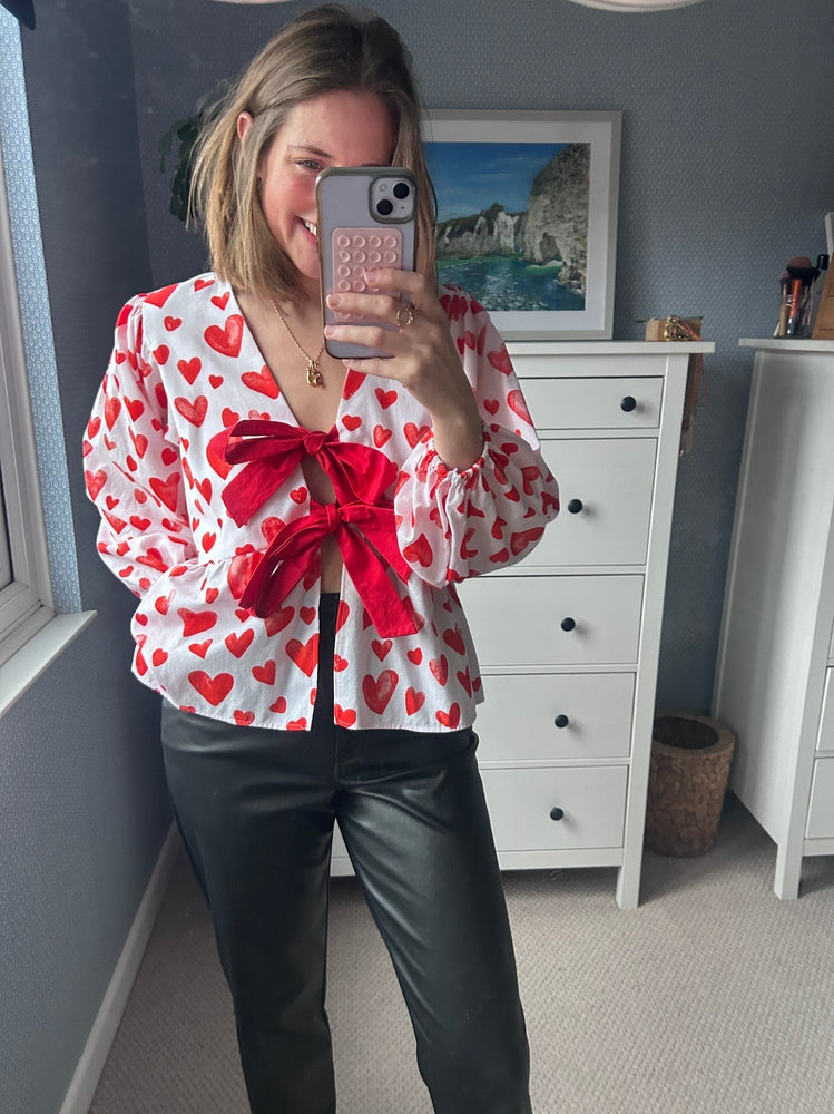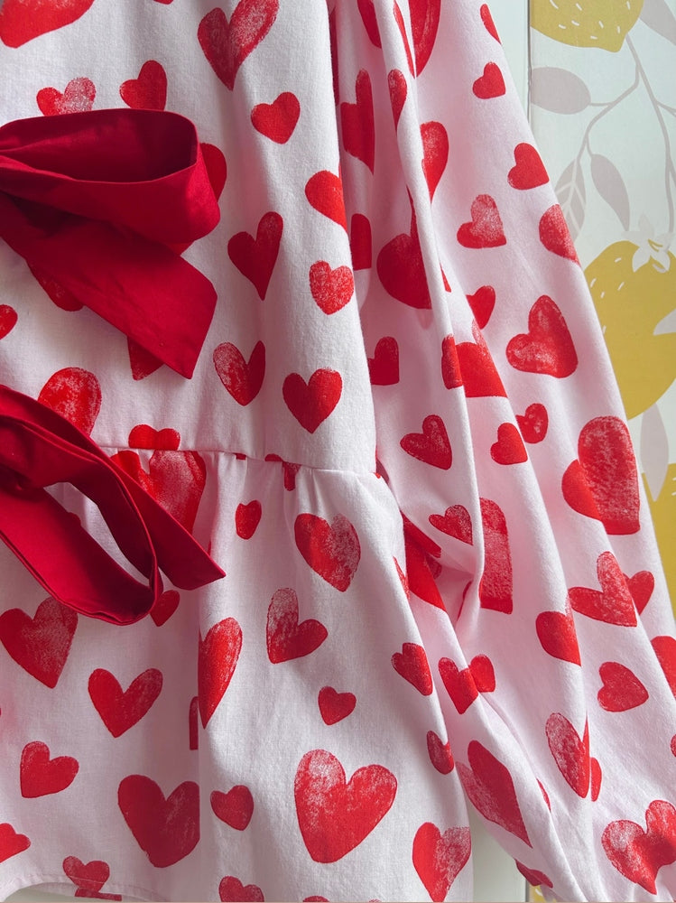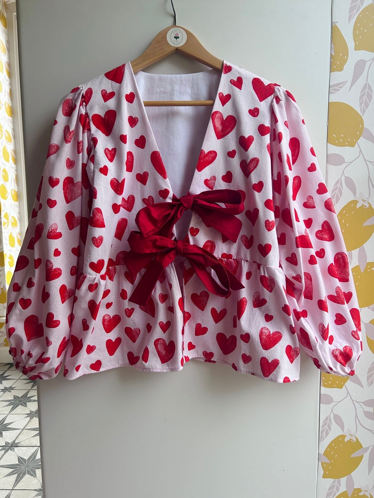 Beautiful Devizes top made from heart fabric. Red ties and peplum hem.
