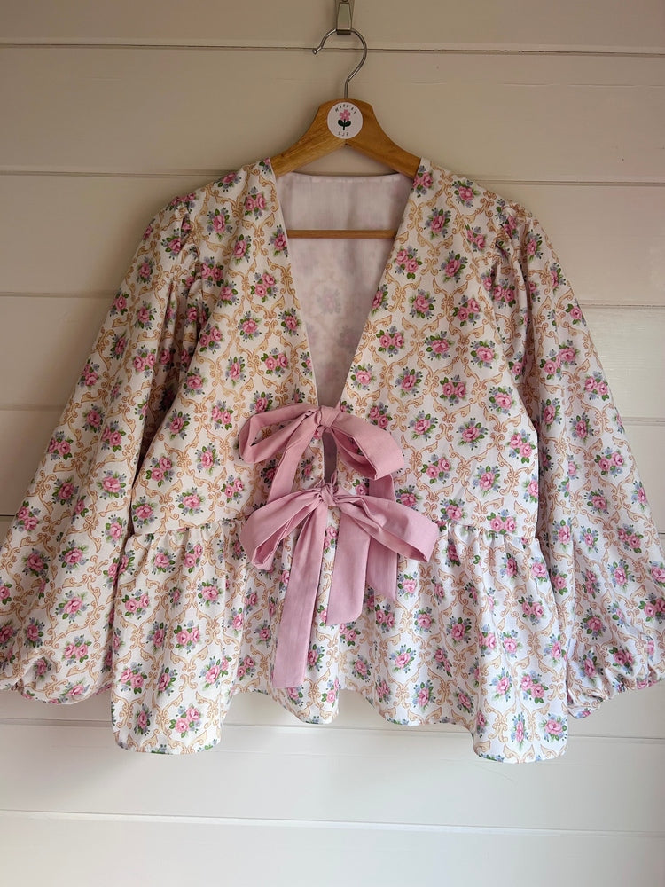 Beautiful Devizes top made from vintage fabric, finished with soft dusky pink ties and a gentle peplum hem that gives the loveliest shape.