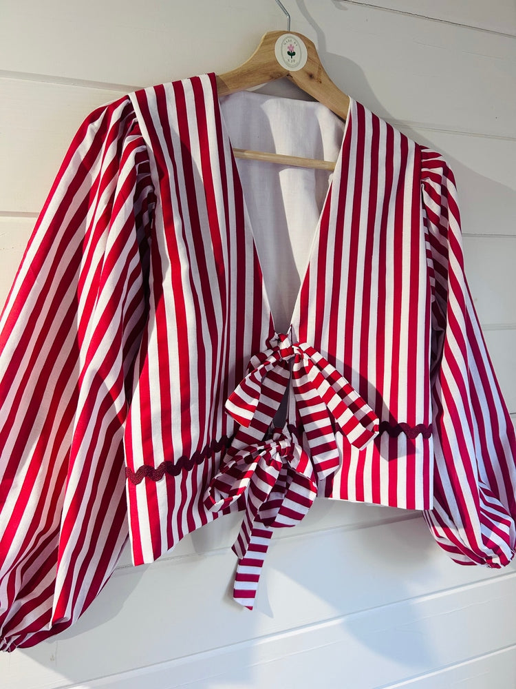 Red and white stripe Devizes top with long sleeves. Ric rac detail around the waist and 2 ties.