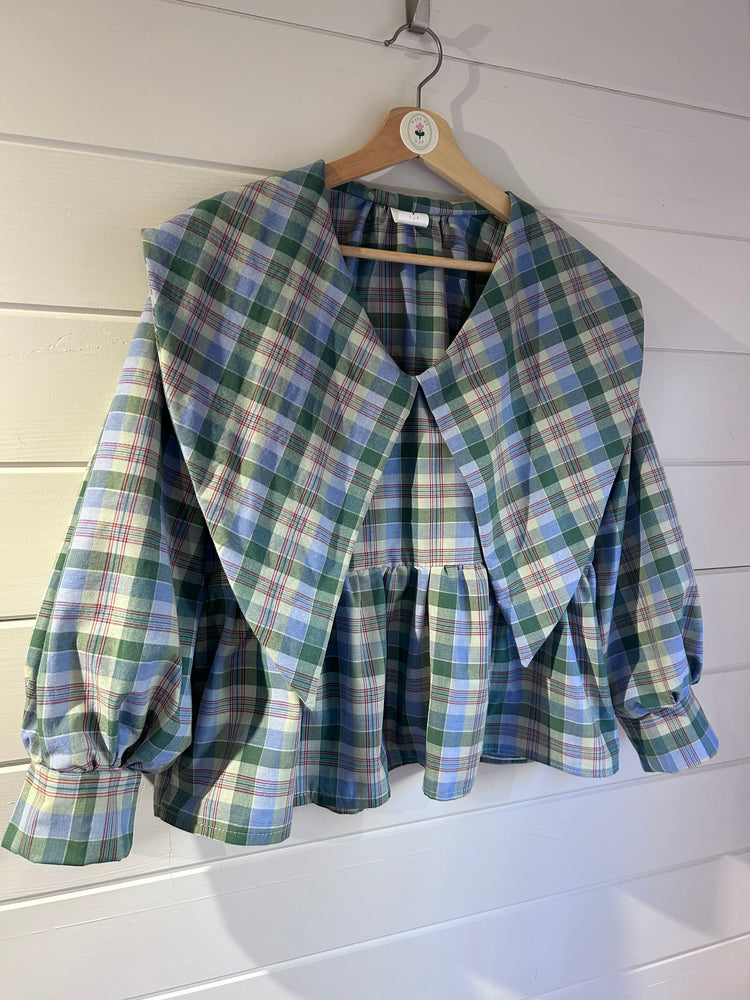 Grimstead top with a pointy collar, peplum hem and long sleeves with plain cuffs. Gorgeous cotton tartan. The perfect blouse!